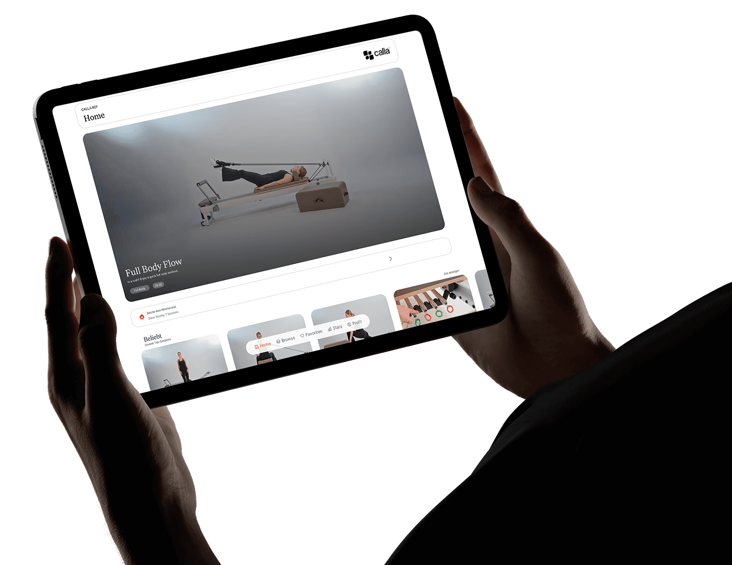 Calla REF brings hundreds of professionally produced sessions to any Reformer, anywhere — streamed on a tablet, guided by certified trainers. At home, in a studio, in a gym, in a hotel. One platform. Endless sessions.